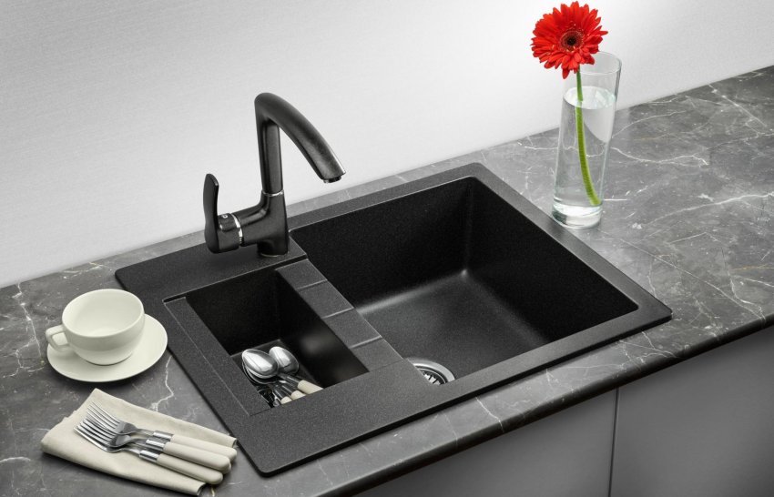 Матовый чёрный смеситель сам по себе выступает украшением интерьера