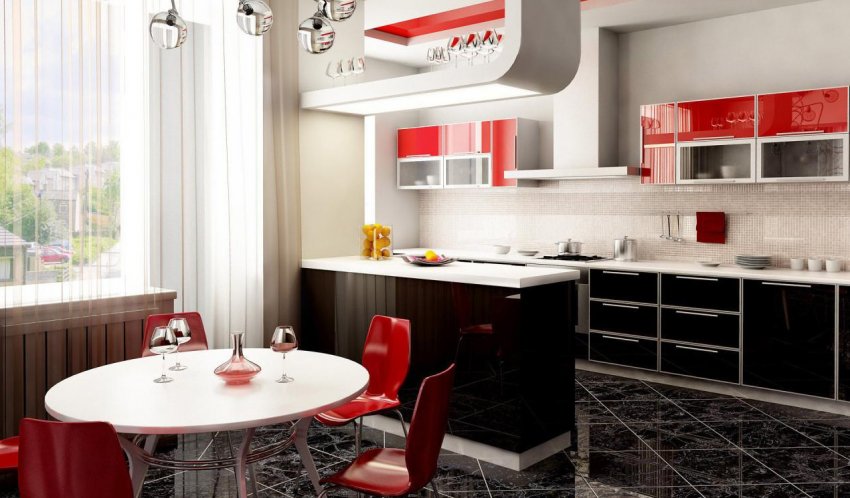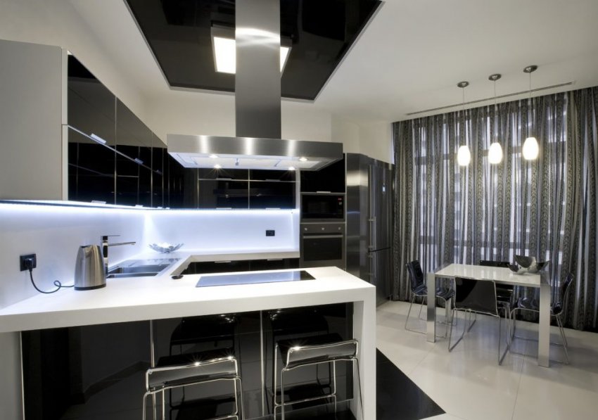 - Чёрно-белая кухня. Распространённое решение — белый верх, чёрный низ. Это делает интерьер более лёгким. Белыми могут быть пол, стены или потолок. Если чёрные шкафы кажутся слишком тяжеловесными, можно разнообразить белую кухню чёрным фартуком, столешницей, аксессуарами. На чёрной кухне эффектно смотрятся белые стулья, светильники или скатерть. Воздушные белые занавески оттенят окно и не помешают притоку света. Подойдут нитяные модели, горизонтальные или вертикальные жалюзи, римские шторы. Не рекомендуется большое количество посторонних цветов и предметов, объёмного декора. Аксессуары лучше делать тоже чёрными или белыми.