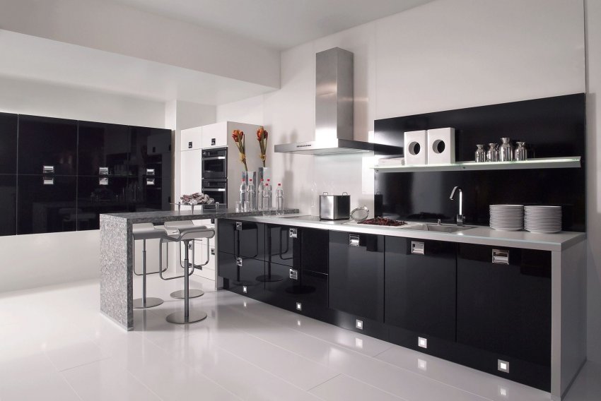 Идеальным оформлением кухни в стиле минимализм будет сочетание только двух цветов — чёрного и белого