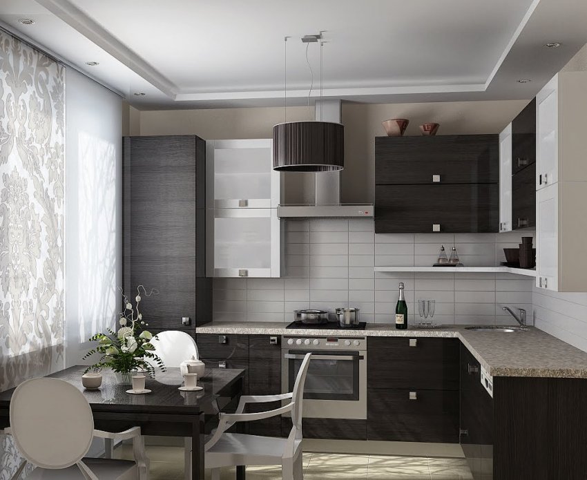 Если же хочется разместить тёмный гарнитур в небольшой кухне, рекомендуется выбирать мебель с глянцевыми, а не матовыми фасадами — отражающийся свет поможет визуально расширить пространство. Но на поверхности глянца сильнее будут видны загрязнения, разводы и отпечатки, следовательно, она будет чаще нуждаться в уборке и полировке.