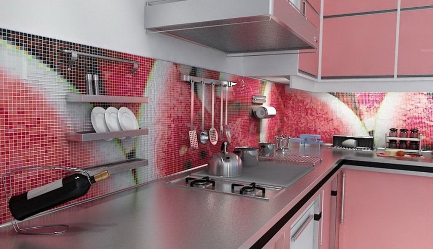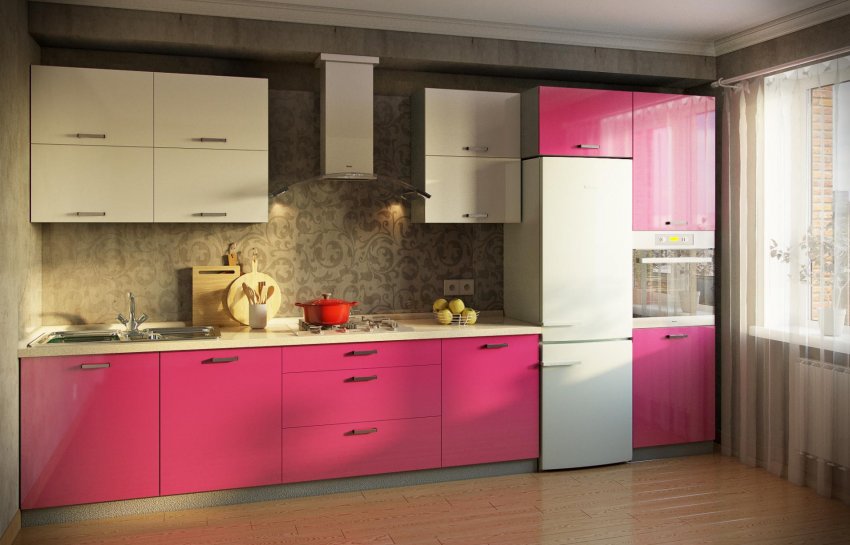 В результате небольших усилий получится современная деловая кухня в розовом оформлении, которая зрительно увеличит помещение, создавая иллюзию открытого пространства, но в то же время будет строгой, что, вероятнее всего, не всем придётся по нраву.