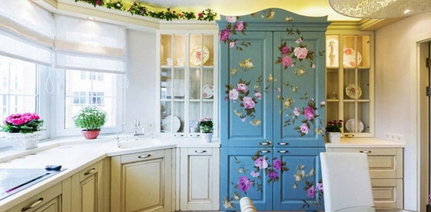 В интерьер кухни гармонично впишутся открытые или закрытые шкафы, декорированные розовым цветочным орнаментом
