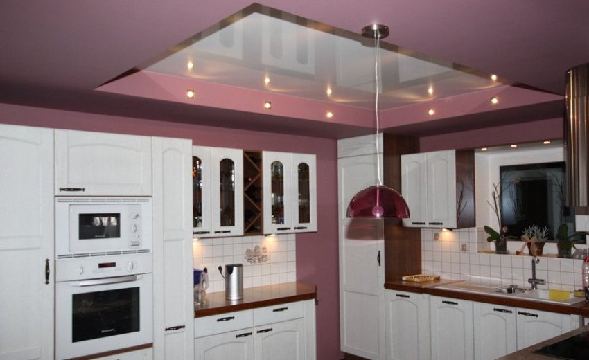 Потолок в розовом дизайне должен соответствовать стилю помещения. Нынче стало модно разграничивать потолок в кухне, оформляя рабочую и обеденную зоны разными материалами, используя для этого: