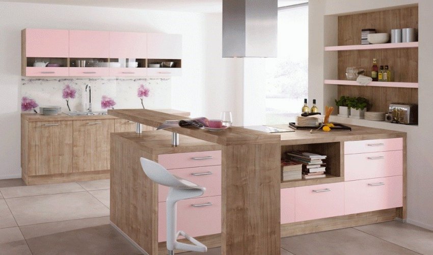 Глянцевые фасады в розовом цвете смотрятся проще матовых и дешевле, особенно при наличии барной стойки
