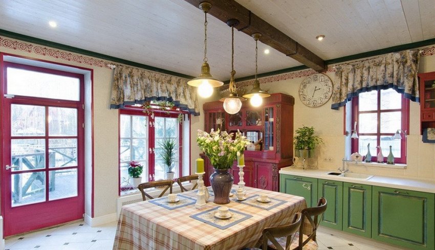 - Разнообразный декор — посуда, выставленная напоказ в стиле шебби-шик, чехлы на стулья разных цветов либо с рюшами для прованса, свисающие люстры или абажуры, дополненные точечными светильниками, картины в массивных рамках, часы. Окна чаще открытые, но иногда украшены римскими шторами.