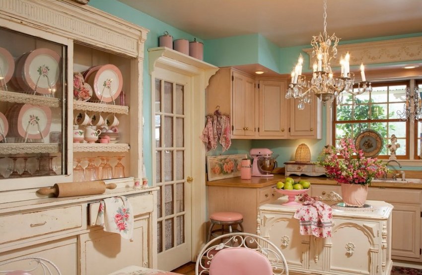 - Светлые кухонные гарнитуры из древесины либо МДФ, искусственно состаренные. Дополнительная меблировка — отреставрированные этажерки в стиле 50-х, комоды, круглые столы и буфеты, покрашенные в бело-розовые колера. Рабочая зона обычно оформляется керамической плиткой в мелкий цветочек.