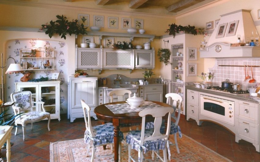 Кухни в винтажном стиле отличаются обилием декора, поэтому не нужно скупиться на украшение интерьера