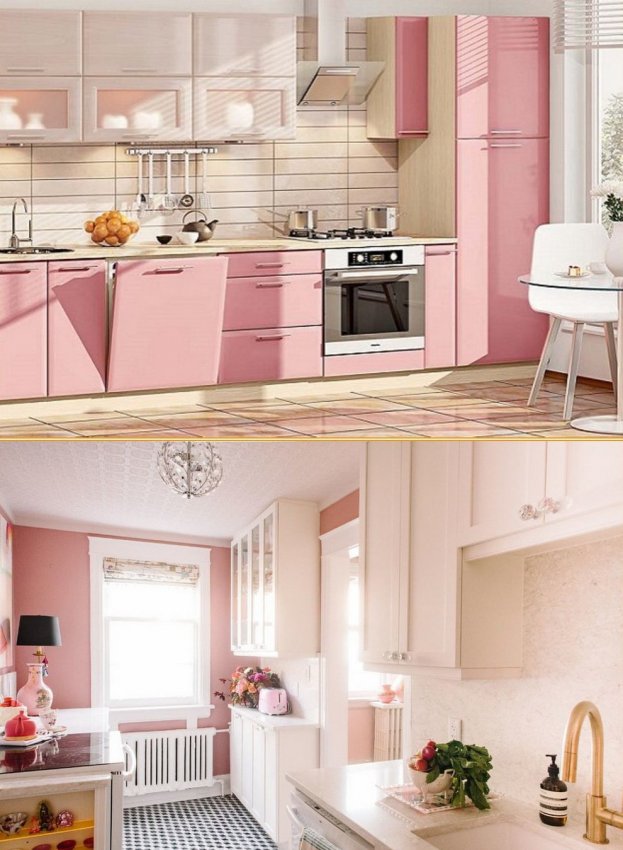 - розовый колер + бежевый или коричневый, которые сделают кухонный интерьер строже;