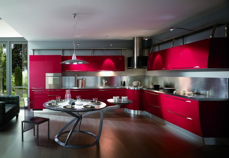 - Обстановка кухонного пространства мебелью с розовыми глянцевыми или матовыми фасадами.