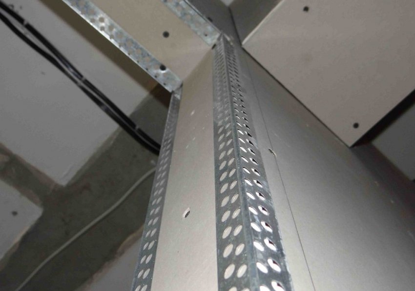 - Стыки и углубления заполните шпатлёвкой, в углах закрепите на неё металлические уголки с сеткой.