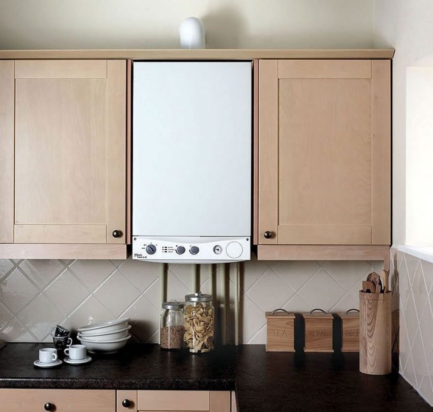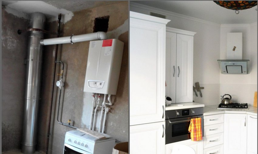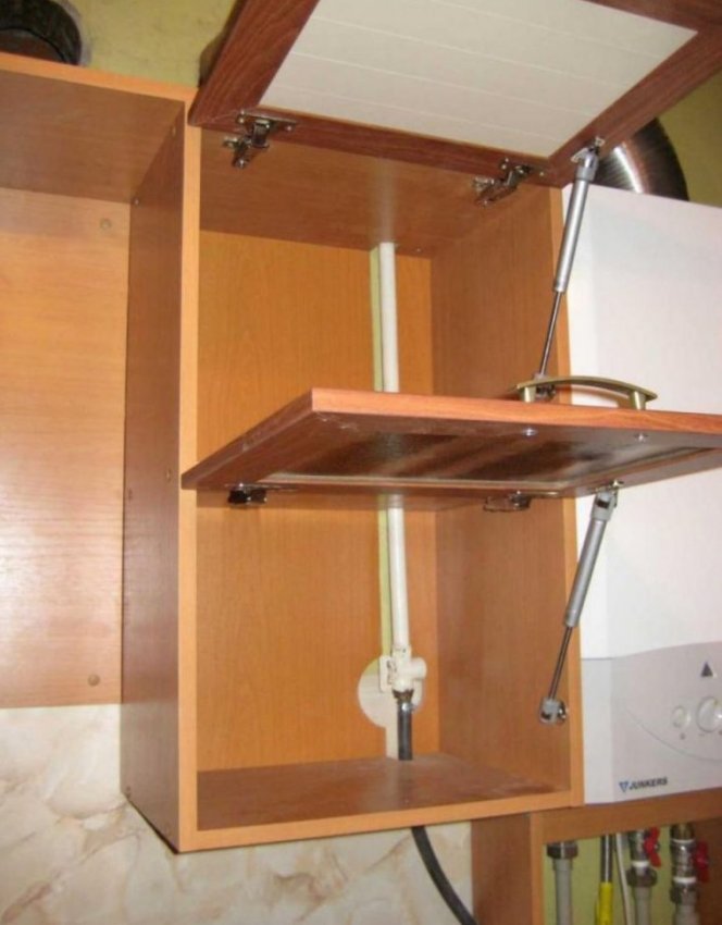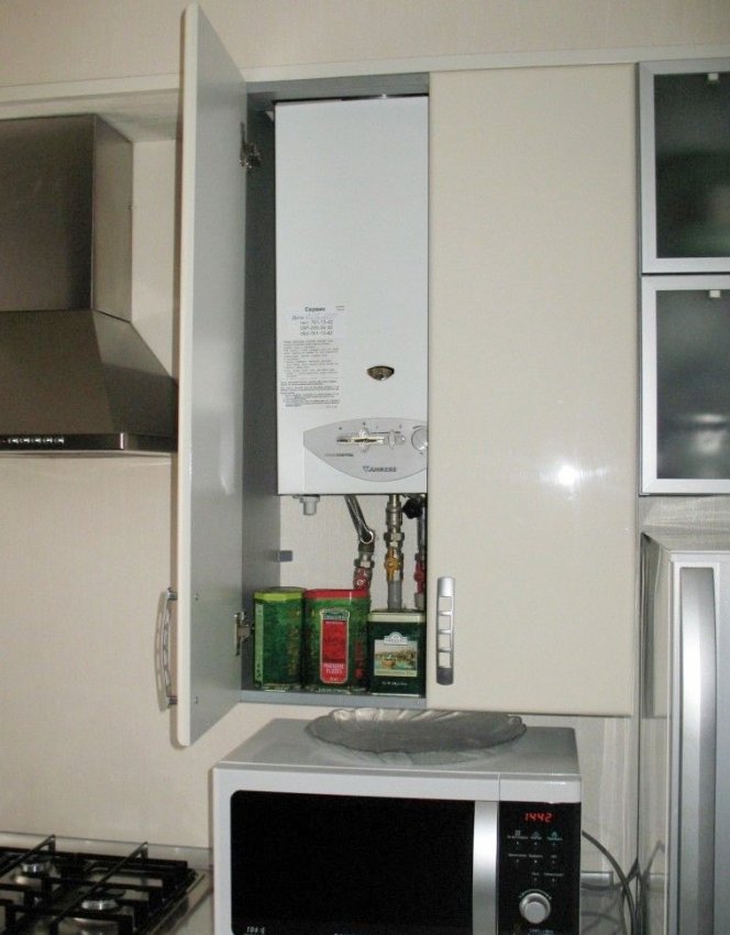Газовую колонку разрешают ставить в шкафчиках с решётчатыми или сетчатыми дверцами, при этом остающиеся на виду трубы прикрывают специальным кофром. Главное условие — обеспечить вентиляцию шкафа сверху и снизу.