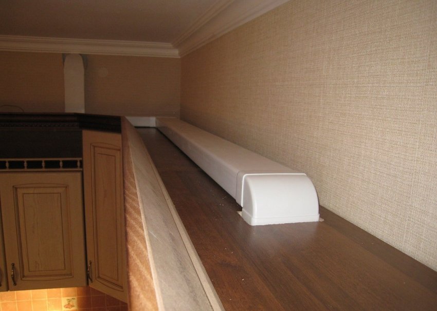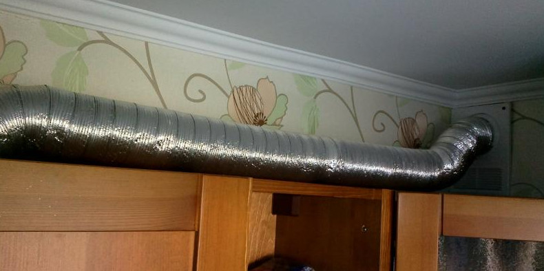Вентиляционные трубы тоже могут спрятаться в верхней части гарнитура. Если же вы не любите шкафов до потолка, стоит сделать широкий бордюр или козырёк с подсветкой. Тогда всё, что находится в углу над ним, будет незаметным. Для лучшего эффекта стоит заменить стандартную блестящую гофру на матовый пластиковый вентканал с прямоугольным сечением.
