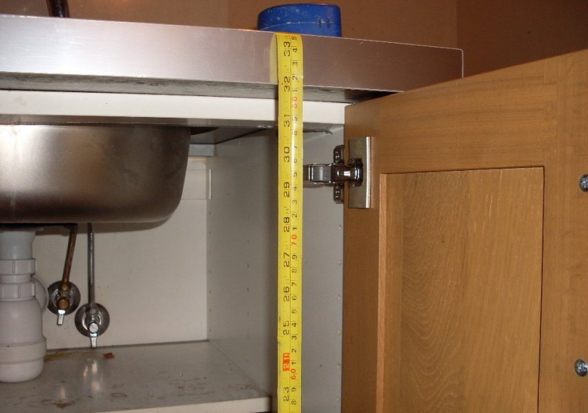 Проще всего указать необходимость спрятать трубы производителям мебели, чтобы ваши тумбы сразу снабдили нужными пропилами. Когда гарнитур уже готов и нужен только один шкафчик/полка для маскировки, стоит заказать раскрой ДСП в строительном гипермаркете и собрать изделие самостоятельно. Понадобится только шуруповёрт со сверлом под конфирматы, сами крепежи и декоративные заглушки. Готовый проект шкафчика несложно найти в сети или, сделав замеры, нарисовать от руки. При необходимости консультант в магазине поможет вам уточнить размеры и форму выпилов.