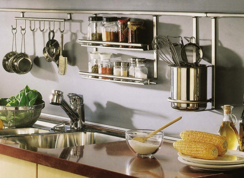 Больше всего проблем доставляют газовые трубы, разветвляющиеся на уровне фартука и зачастую расположенные на отдалении от стены. Сделать уход за ними проще не получится, зато можно дополнить этот подарок судьбы крючками для кухонных принадлежностей, подвесными корзинами или магнитами. Ещё лучше такая система будет смотреться в сочетании с покупными рейлингами.