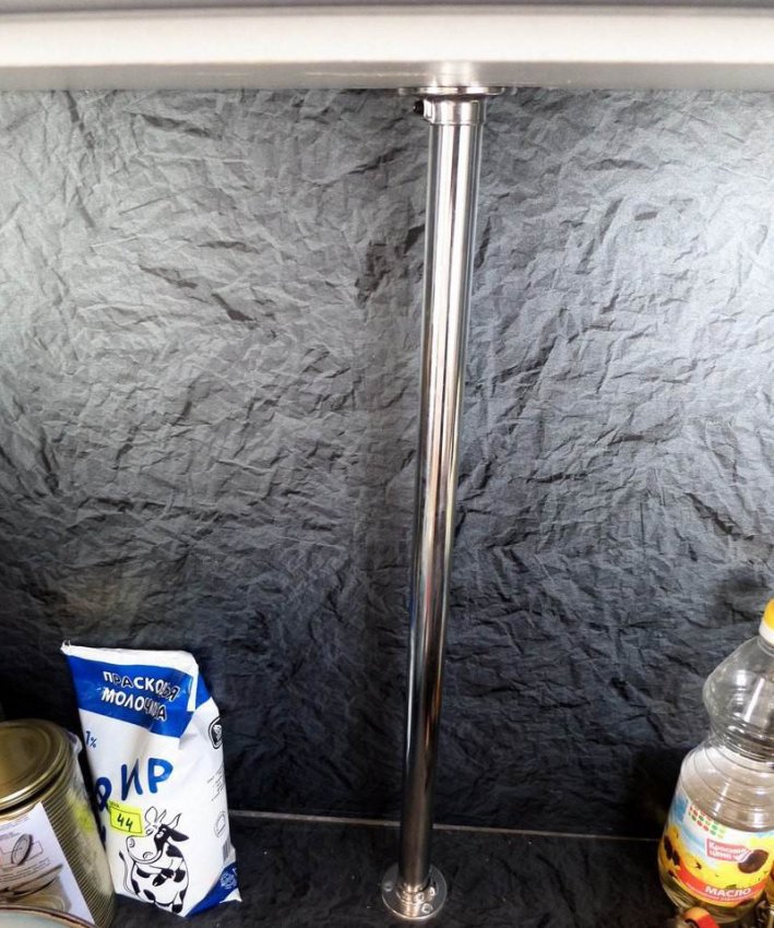 Если вам досталась не труба, а тонкий вертикальный шланг, его можно поместить в хромированную трубку и оформить стыки специальными накладными кольцами. Такой приём хорошо смотрится, если подобные трубы используются в барной стойке, ножках столика, дополнительных полочках и других элементах кухни.