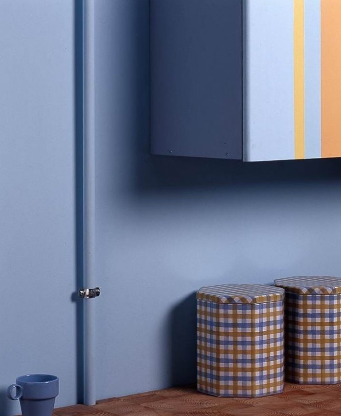 Краску используют в двух случаях: либо для маскировки труб, либо для их выделения. Окрасить трубу под цвет стены — самый простой способ её скрыть. Эффективнее всего этот метод работает на тёмных поверхностях (так прячется не только труба, но и её тень) или на стенах с полосами.
