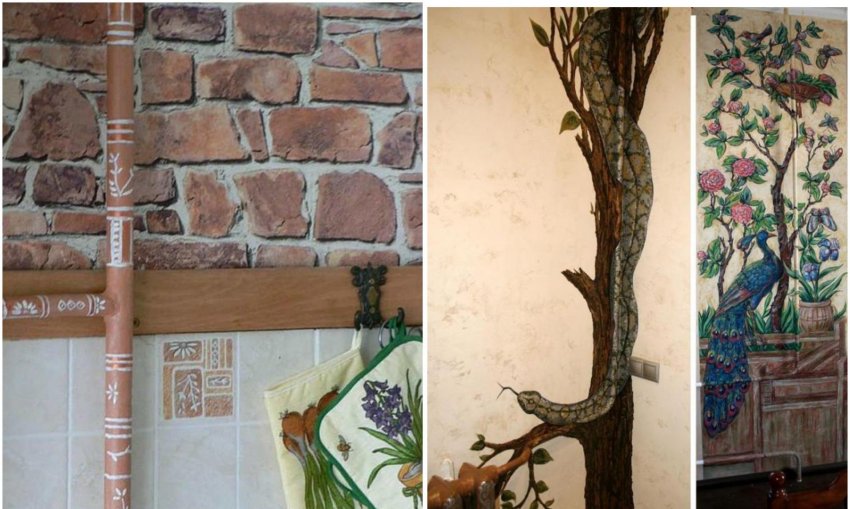 Аналогично работает и декоративная роспись труб. Когда их много, выделять следует только одну-две. Если на видном месте только одна труба, выбирайте цвета и узоры, которые сочетаются с остальной обстановкой комнаты. Тем, у кого нет художественных навыков, следует выбирать простые рисунки: полосы (поможет малярный скотч), пятна (можно сделать штампом из губки), имитацию дерева (фактура появляется из-за следов от жёсткой кисти).