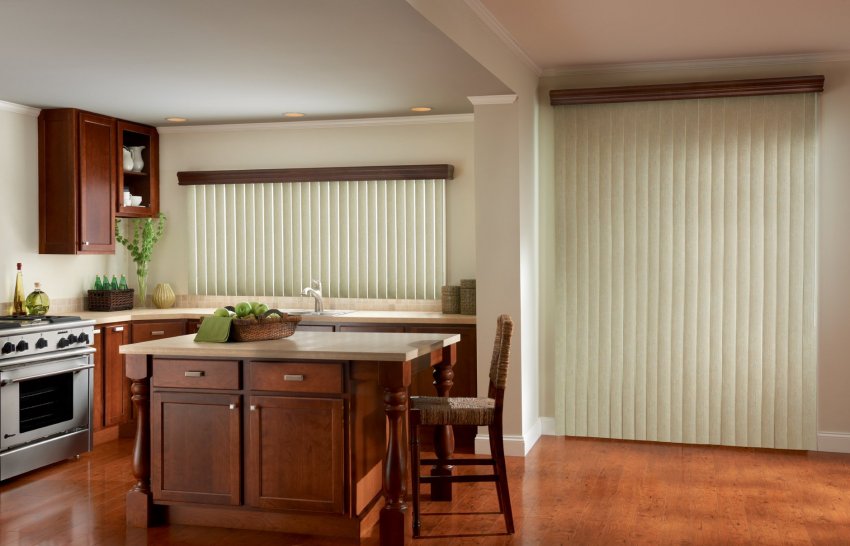 Простые лаконичные жалюзи хорошо смотрятся даже в классических кухнях