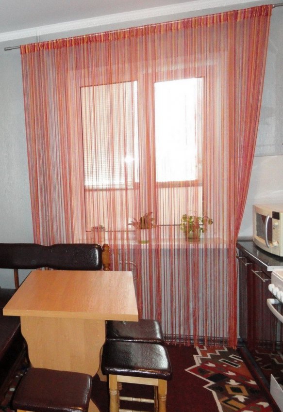 - дополнить роллет или римку нитяными шторами контрастного цвета. Яркие тонкие вертикали будут надёжно отвлекать внимание от стены и коммуникаций. Если же вы активно пользуетесь подоконником, нити можно подстричь «чёлкой», волной либо аркой;