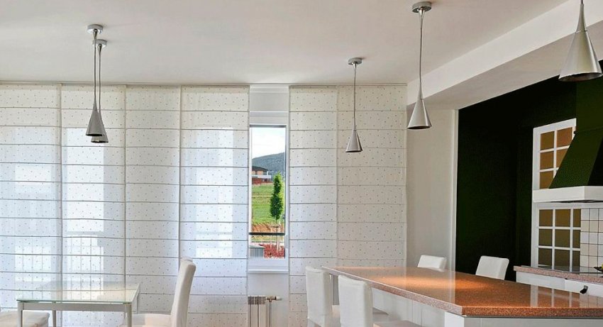 Японские шторы можно использовать как сами по себе, так и в комплекте с роллетами или плиссе