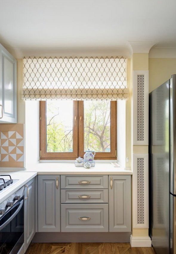Идея спрятать неприглядный стояк за шторкой приходила ещё к нашим бабушкам, с тех пор этот метод прочно прижился на кухнях. Но сейчас всё больше хозяек отказывается от тюля и портьер в зоне готовки, заменяя их на жалюзи, римские шторы или роллеты. Как же совместить любовь к практичности и нежелание смотреть на голые трубы? Существует несколько подходов: