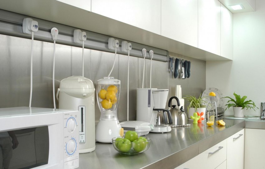 Во время планирования размещения на кухне розеток надо учитывать энергопотребление и количество бытовой техники, которая здесь будет использоваться. Для энергоёмких агрегатов нужно прокладывать отдельные линии. Кроме этого, должны быть розетки для подключения той техники, что используется периодически. Количество одновременно подключаемой к каждой линии техники не должно превышать мощность, на которую рассчитана проводка.