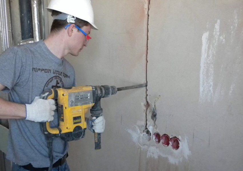 Для установки скрытой проводки в стене надо сделать борозды, в которые будет уложен кабель. Штробить стены можно только в горизонтальном или вертикальном направлении, так как при выполнении работ по диагонали есть большой риск получения травмы.