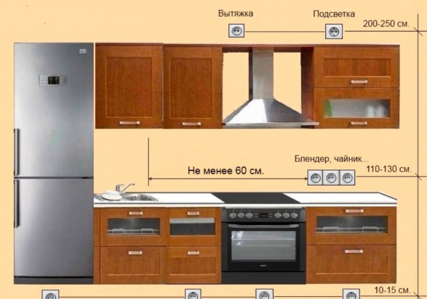 - верхняя — находится выше корпуса подключаемого прибора. Так обычно подключается вытяжка и освещение рабочей поверхности. Розетка должна находиться не ближе 15 см от потолка или 10 см от края верхнего шкафа.