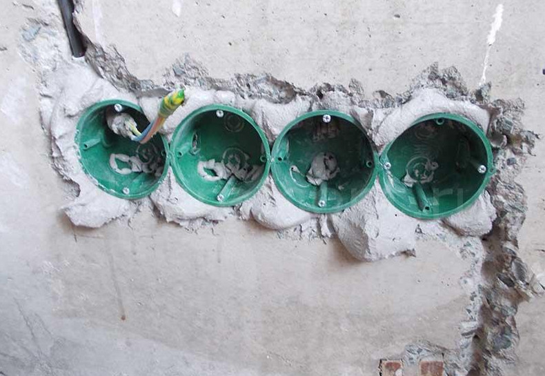 - Прокладка проводов и установка розеток. При расключении розеток необходимо тщательно протягивать все контакты. В некачественно затянутом соединении провод будет нагреваться и со временем отгорит.