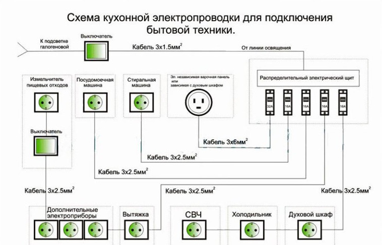 - Выбор сечения кабеля. Чтобы кухонное оборудование могло нормально работать, необходимо использовать кабель сечением от 2,5 до 6 мм2 в зависимости от суммарной мощности подключённых приборов.