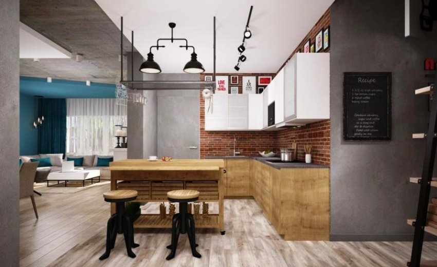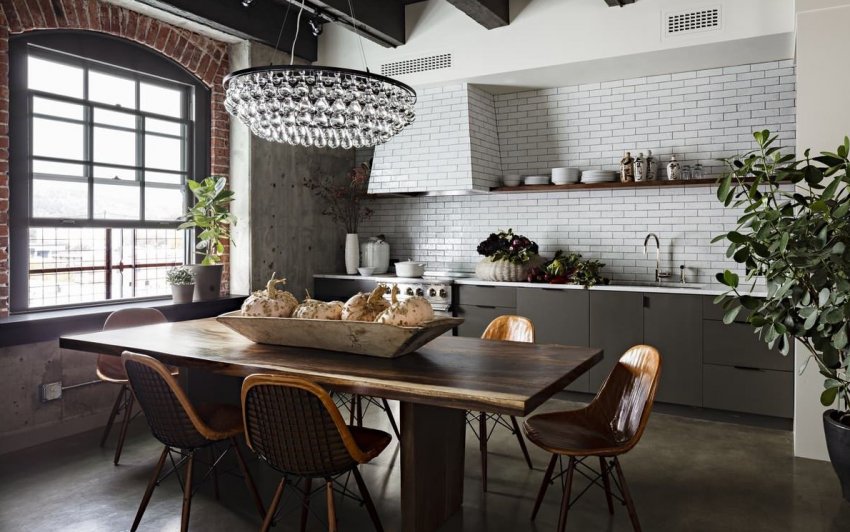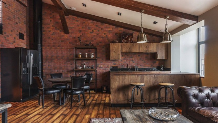 Кухня-гостиная в стиле лофт отличается практичной мебелью