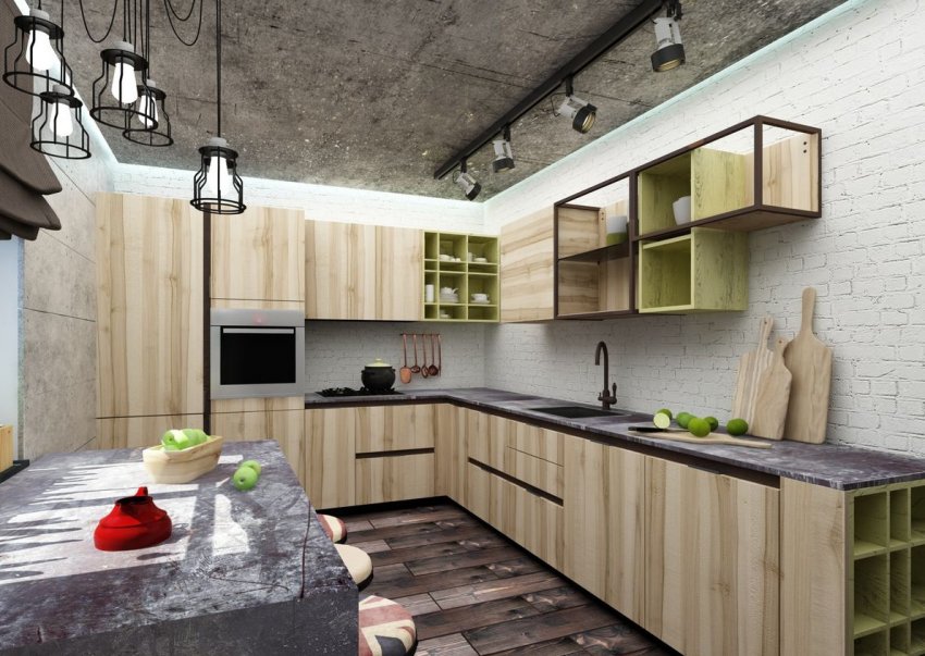 При оформлении кухни в стиле лофт можно сэкономить на отделке стен или потолка