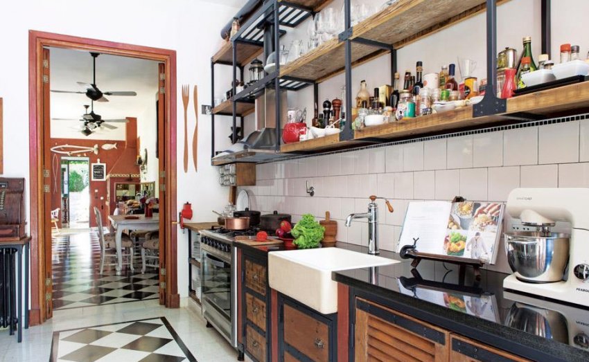 Полки вместо настенных шкафов — хорошее решение для кухни в стиле лофт