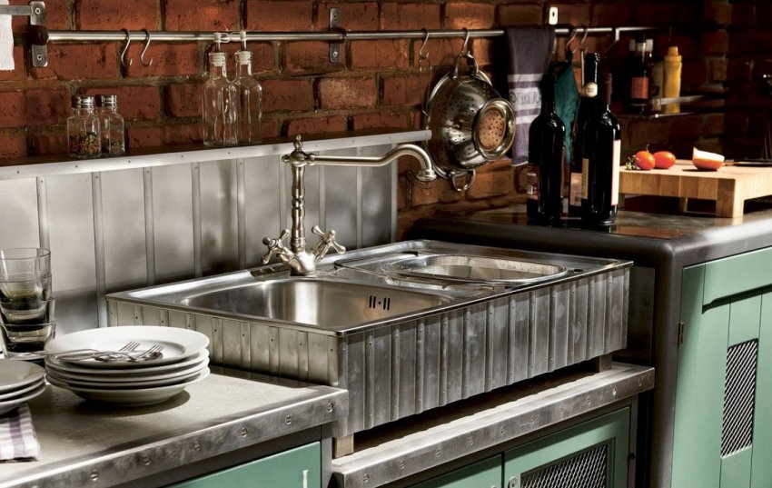 - блестящие металлические смесители, каменная мойка и другие детали подходят для кухни в стиле лофт, обустроенной в частном доме или квартире. Если кухня просторная и площадью более 10 м2, то в комнате легко поместится большая и удобная мойка с тумбой;