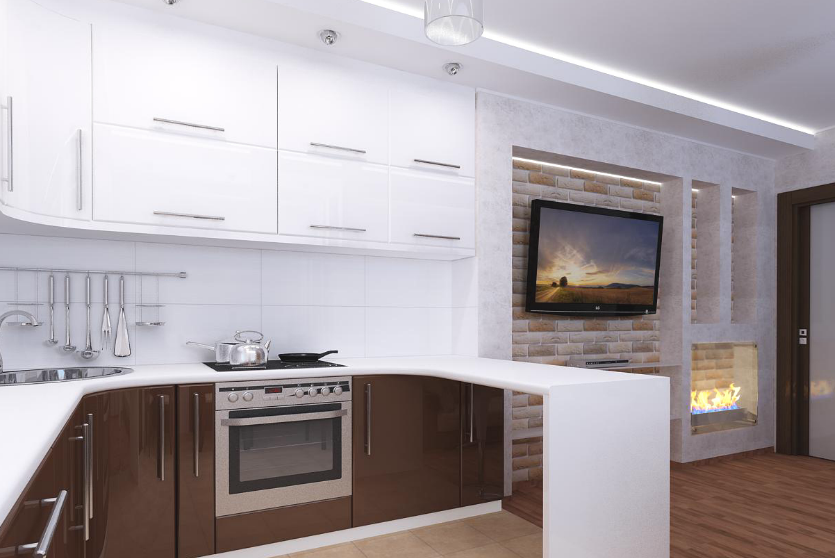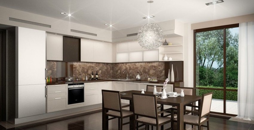 - коричневый и белый — классическое сочетание для спокойной, стильной и практичной обстановки на кухне. Рабочие поверхности стоит сделать коричневого практичного цвета, а шкафы или стены оформляют в белом тоне;