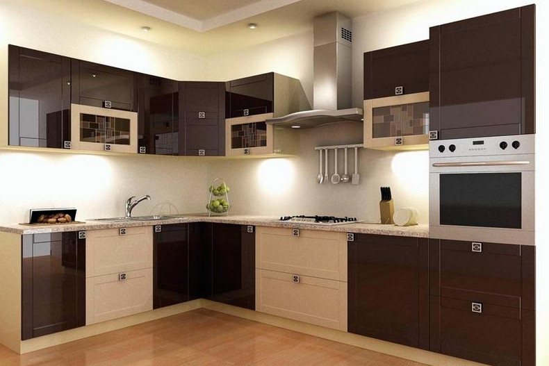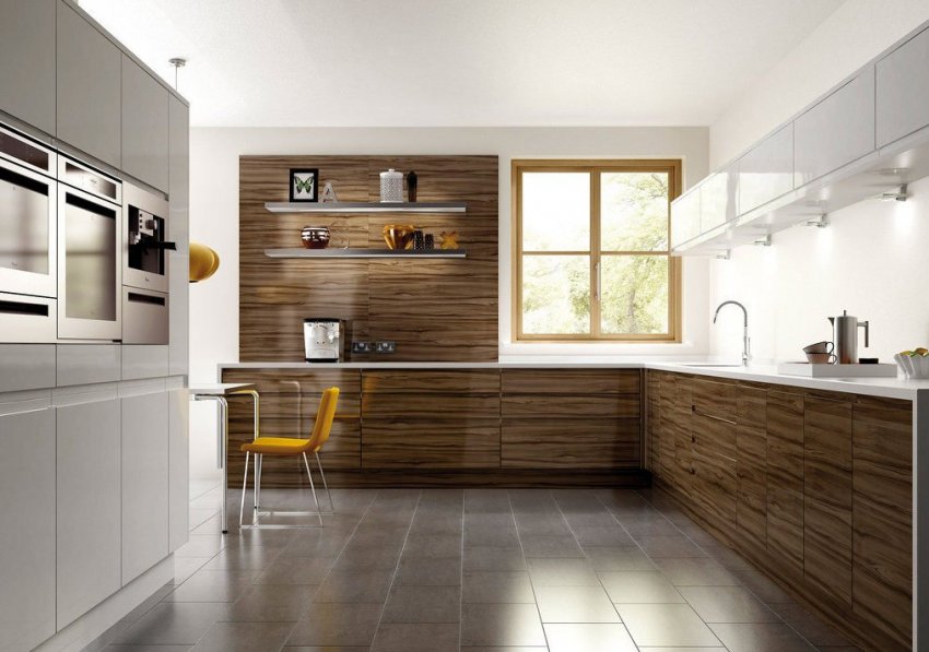 - в стиле минимализм уместна мебель коричневого цвета. Часто сочетаются шкафы с однотонным покрытием и рисунком в виде структуры древесины. Уместна и однотонная мебель или напольное покрытие, фартук или потолок. При этом не используются декоративные элементы;