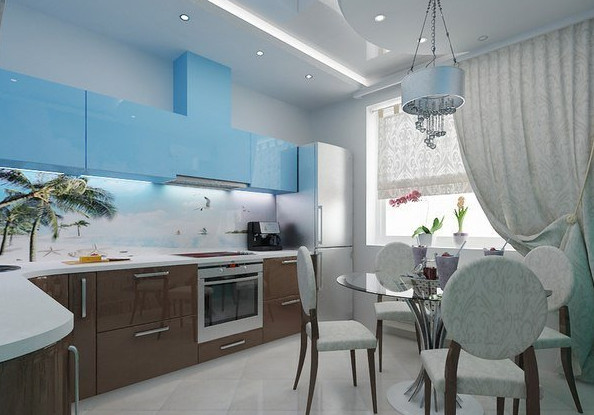 - коричневый потолок — эффектное решение для стильной кухни. Для этого удобнее всего монтировать натяжное ПВХ покрытие, которое может быть с узором или однотонным, двухцветным или простым, глянцевым или матовым. Для низкого потолка оптимален глянцевый вариант покрытия, который визуально увеличивает высоту потолка. Матовые более лаконичны и универсальны в применении;