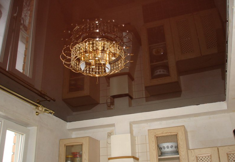 Коричневый глянцевый потолок подходит для небольших кухонь