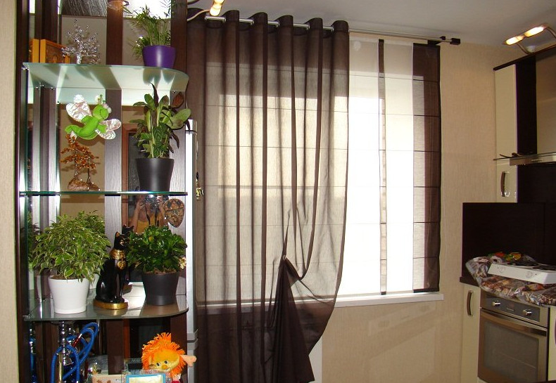 - текстиль коричневого цвета — хорошее решение для того чтобы сделать яркую или просторную кухню более строгой и уютной. Шторы любого типа должны сочетаться с салфетками и другими текстильными деталями в помещении. Допустимы отличия по цвету на 1 – 2 тона. Уместны двухцветные шторы, например, с полосами коричневого и бежевого цвета. Текстильные детали могут быть выполнены как из натуральных тканей, так и из синтетических.
