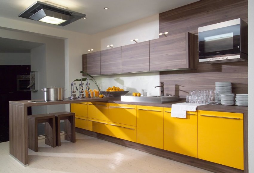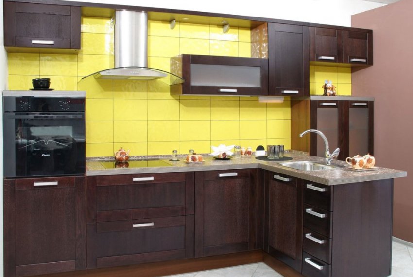 - жёлтый цвет в сочетании с коричневым — стильное решение для кухни. Коричневый гарнитур и жёлтый фартук являются наиболее распространённым решением. Можно использовать и другие вариации, но не следует злоупотреблять яркими жёлтыми деталями;