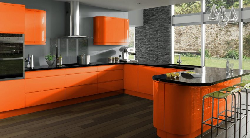 - оранжевый — частое дополнение к коричневому. Деталей такого насыщенного цвета не должно быть много. Фартук, напольное покрытие, текстиль или двухцветная мебель — подобные элементы дополнят основной коричневый тон в обстановке;