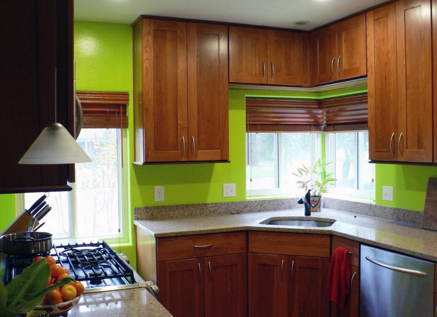 - зелёный тон оживляет мрачноватый коричневый и делает интерьер приятным. В дизайне уместен как оригинальный салатовый, так и более спокойные тона зелёной гаммы;