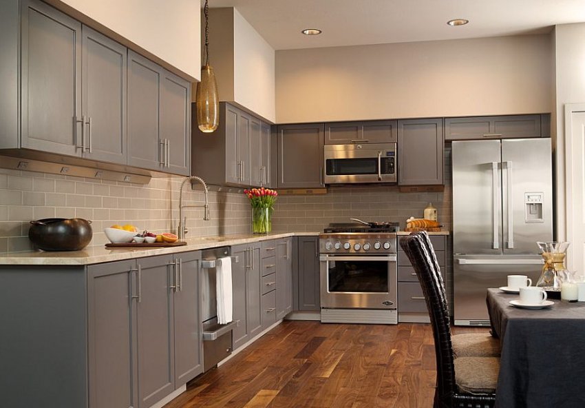 - серый цвет усиливает благородность коричневого. В обстановке можно использовать как тёмный, так и светлый серый тон. Он не делает дизайн мрачным и подходит для кухни любой площади и стиля.