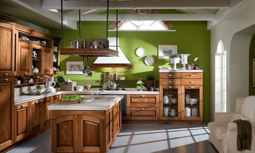 Интерьер помещения кухни может быть в любом стиле, но лучше всего коричневая палитра подходит к следующим направлениям дизайна: