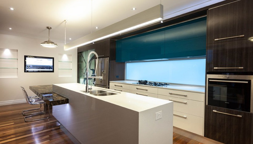 - стекло подходит для фартука, столешницы, фасадов настенных шкафов. Лучше всего использовать закалённый материал, устойчивый к ударам и механическому воздействию;