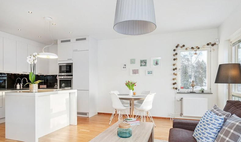 - для обустройства кухни гостиной следует определить расположение каждой зоны. Со стороны гостиной располагается диван, а дополнительно можно использовать журнальный столик, пуфы и другие предметы мебели;