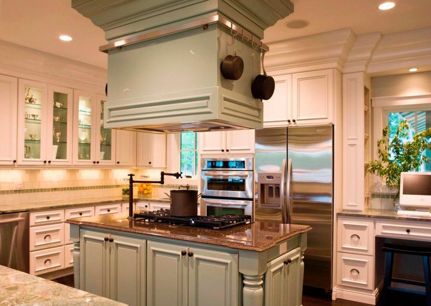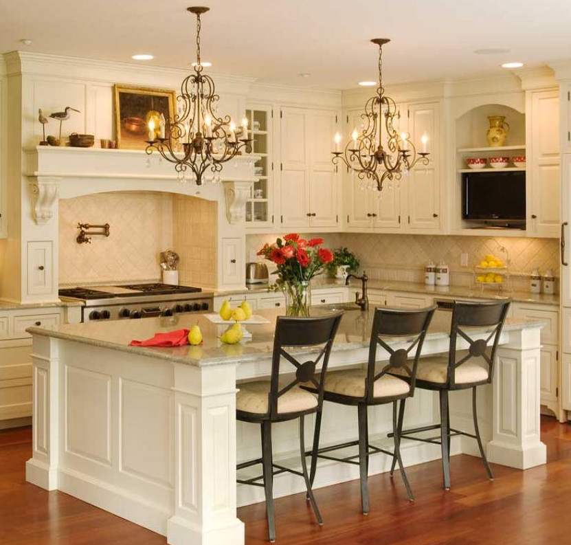 - в классическом интерьере островная зона выглядит особенно эффектно. Это направление дизайна предполагает использование светлой мебели с резными филёнками, золотистой фурнитуры, кружевных штор или тюля, хрустальных или кованых люстр;