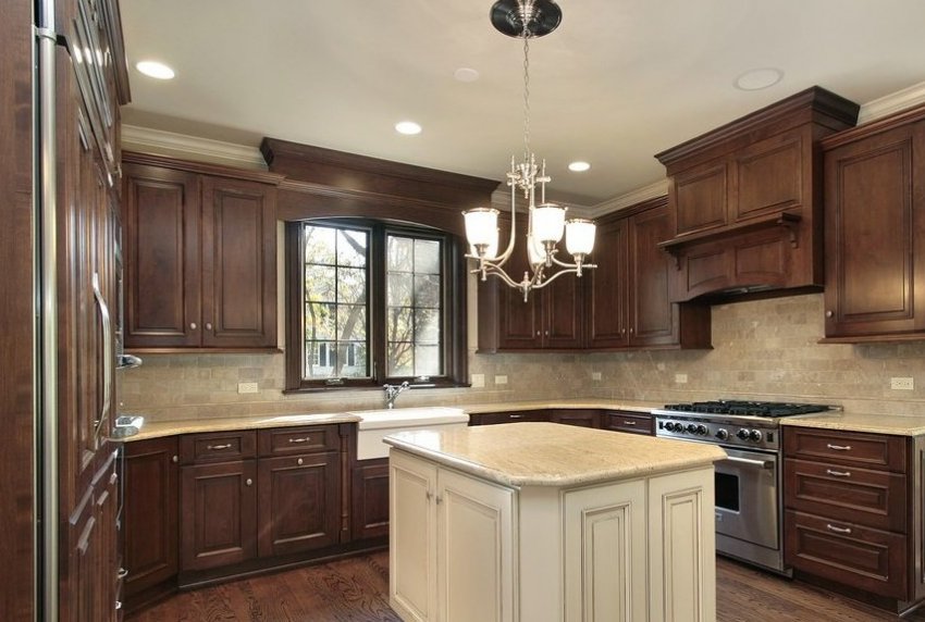 - над островной мебелью располагают люстру или светильники, что обеспечит комфортную эксплуатацию этой зоны. В настенные шкафы дополнительно можно установить встроенные точечные приборы. Основным источником света является люстра, которую часто размещают над обеденным столом. Точечные приборы легко монтируются в ниши, потолок и другие поверхности, выполняя роль дополнительного освещения. В современном интерьере можно использовать разноцветные светодиодные ленты для подсветки низа острова, что обеспечит футуристичный эффект;