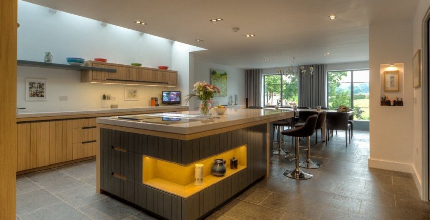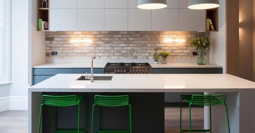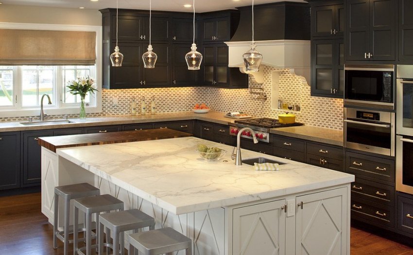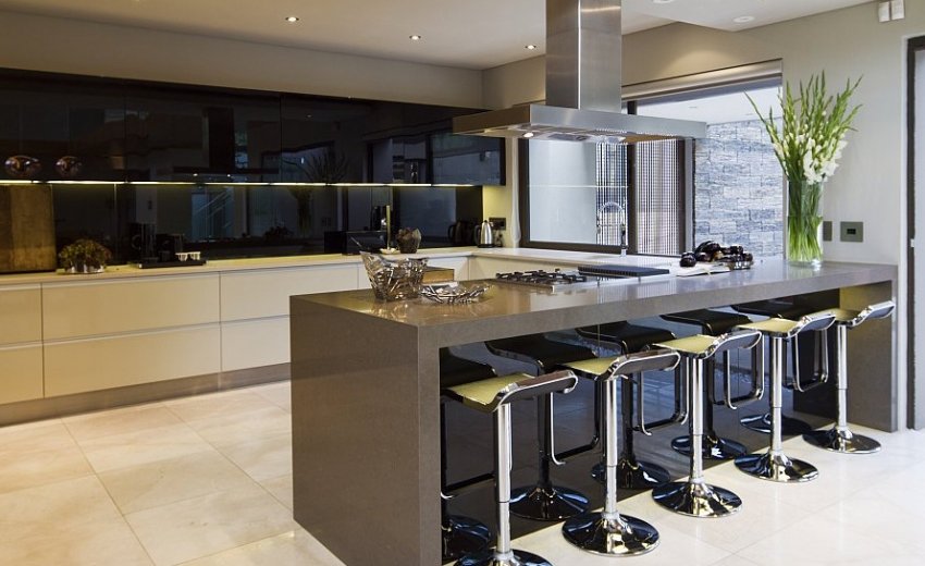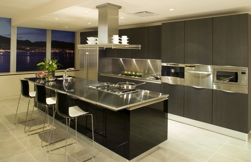 - стильный вид кухни, а островная мебель подходит для помещений любого дизайна;