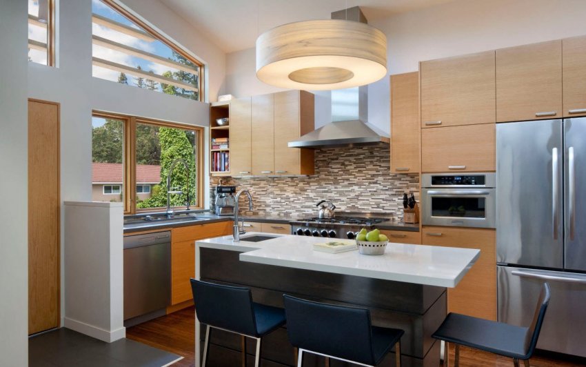 В дизайне кухни с островной зоной следует учесть такие особенности, как: